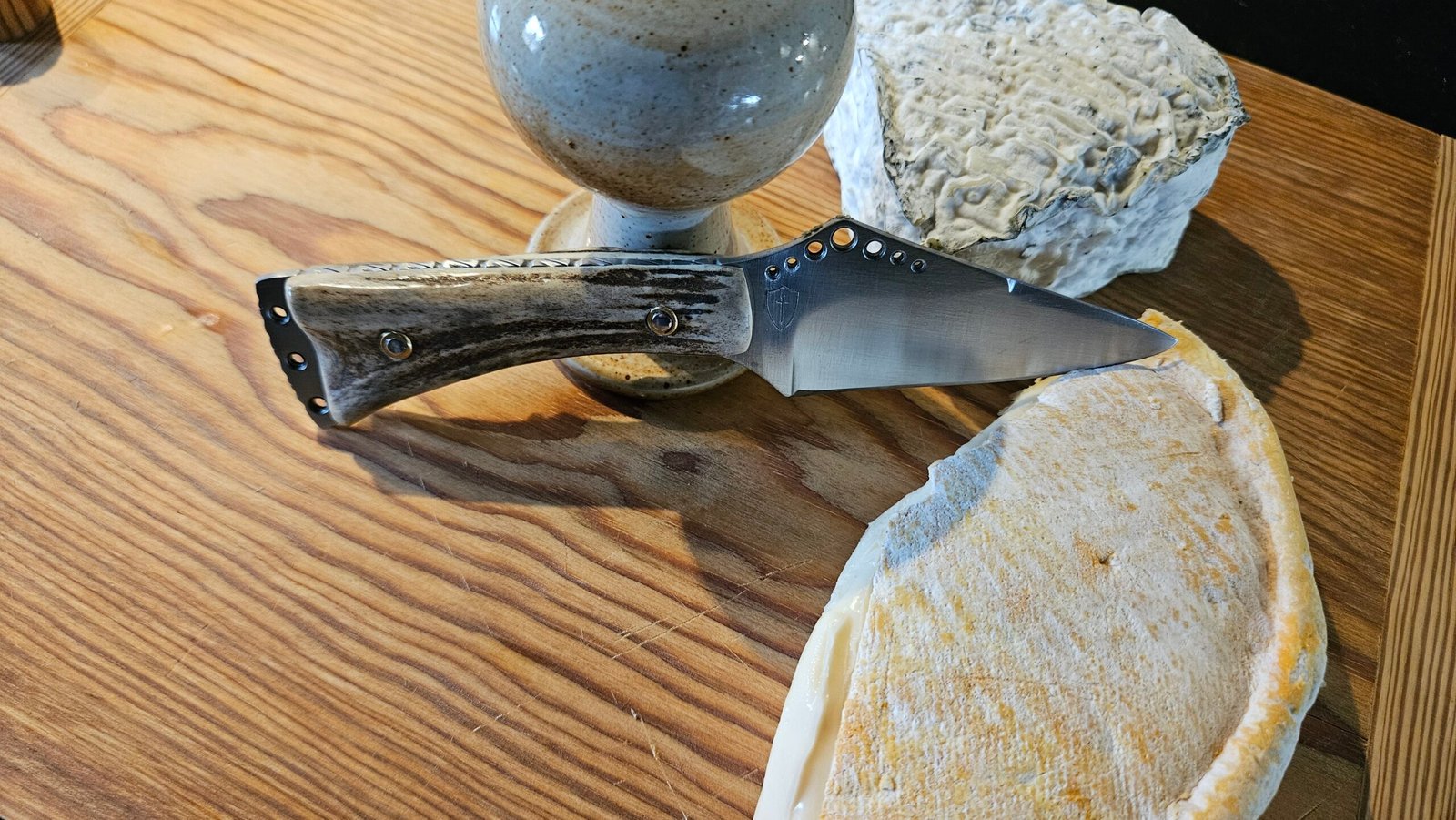 Original couteau à fromage en inox Z40. Manche en bois de cerf riveté inox sur rondelles laiton. Guillochage maison sur le dessus. Longueur totale 18 cm