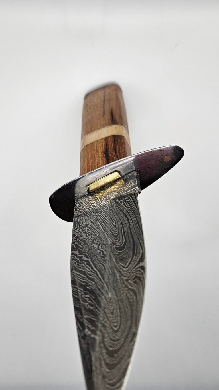 Couteau pliant Liner Lock simple mais élégant. Lame carbone et platine inox. Guillochage maison. Plaquettes en buis naturel. Longueur totale: 17 cm