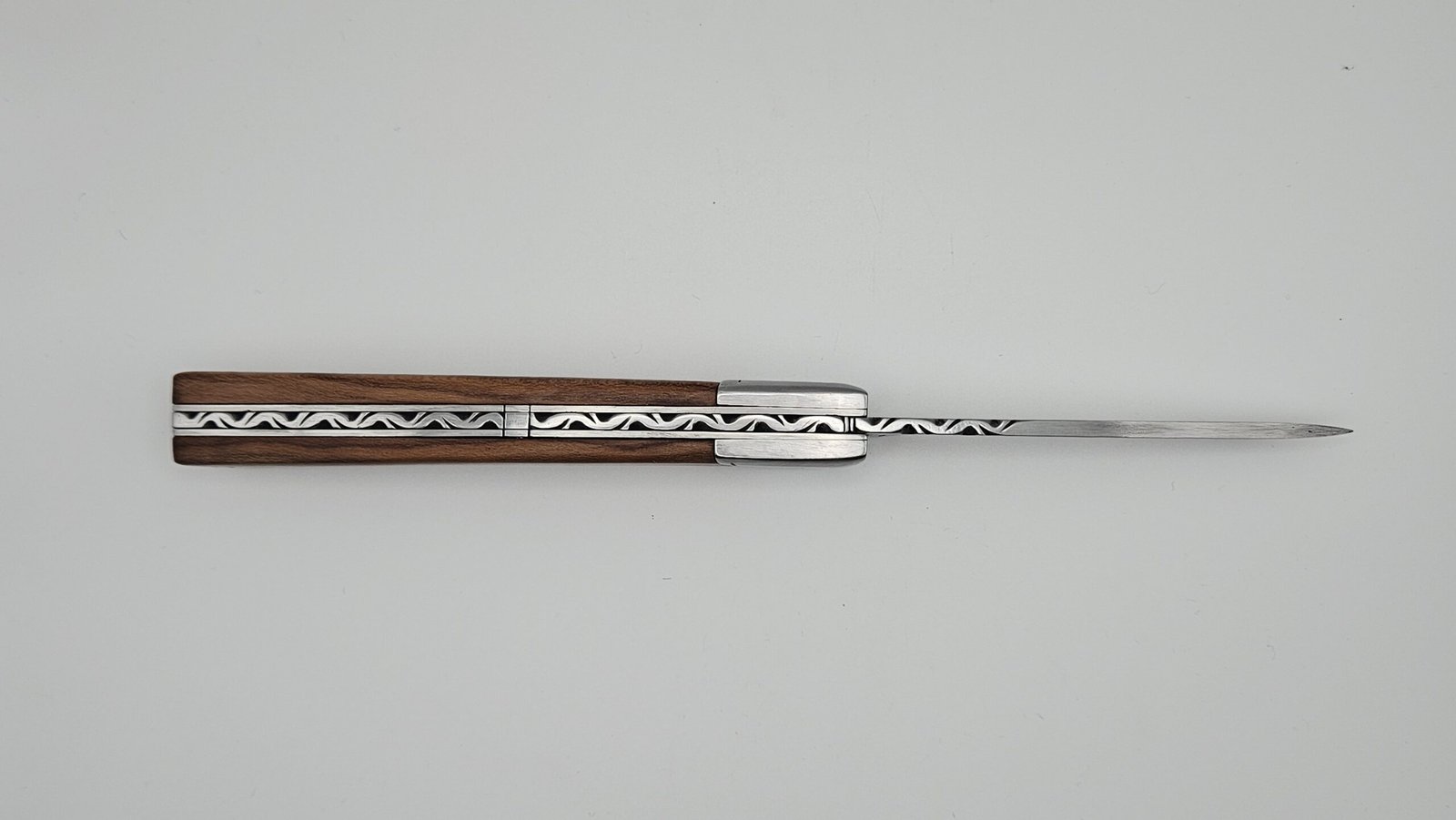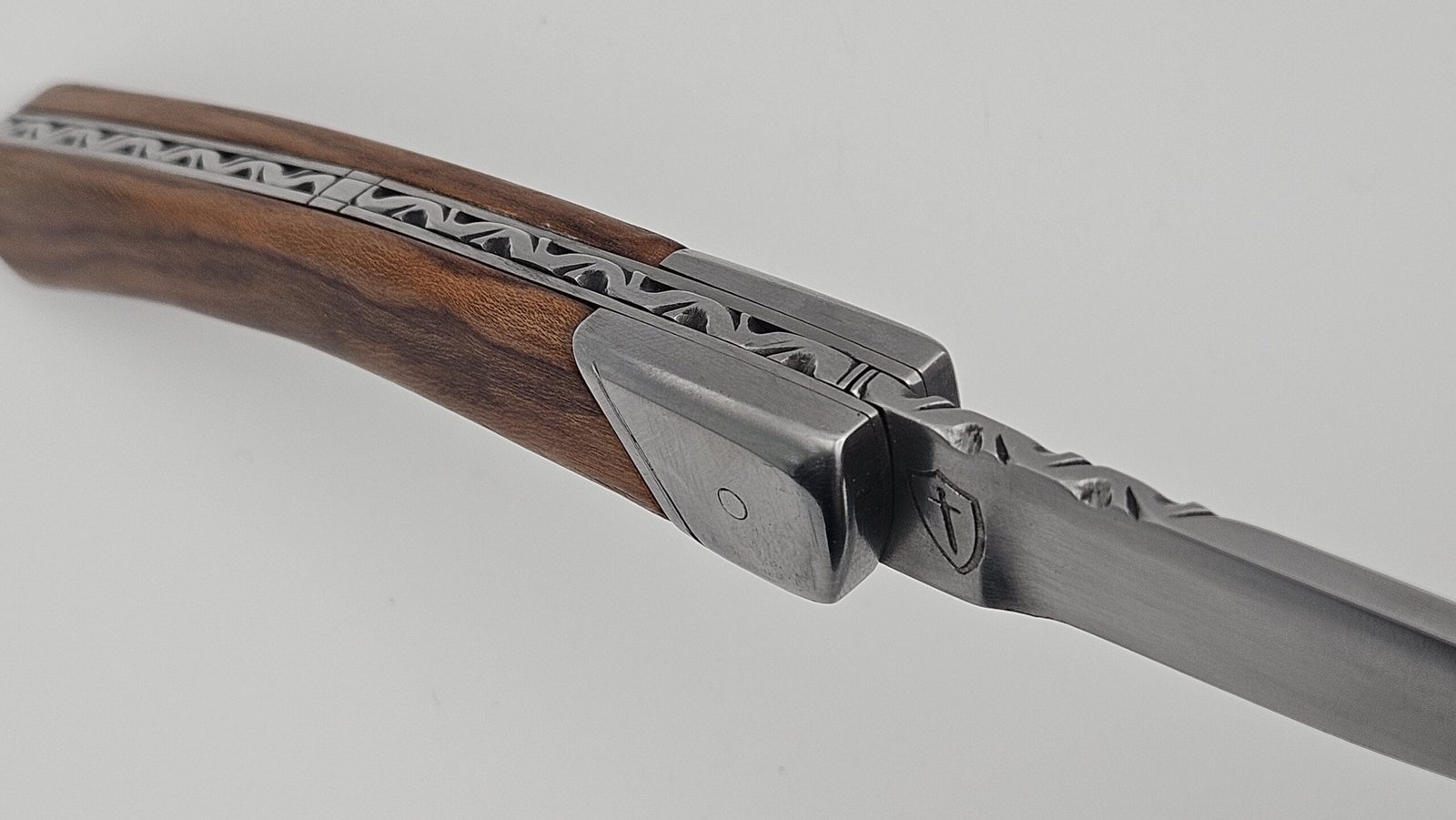 Le manche est façonné dans un bois de cornouiller mâle, une essence réputée pour sa robustesse, son grain fin et sa teinte chaleureuse. Chaque ligne est mise en valeur par un guillochage entièrement réalisé à la main, sur le dessus comme à l’intérieur du ressort, rendant chaque pièce unique.