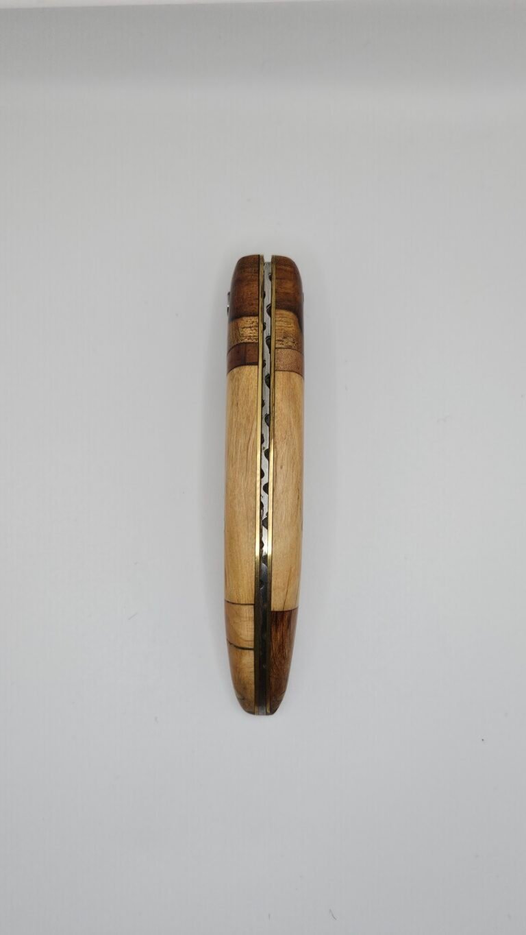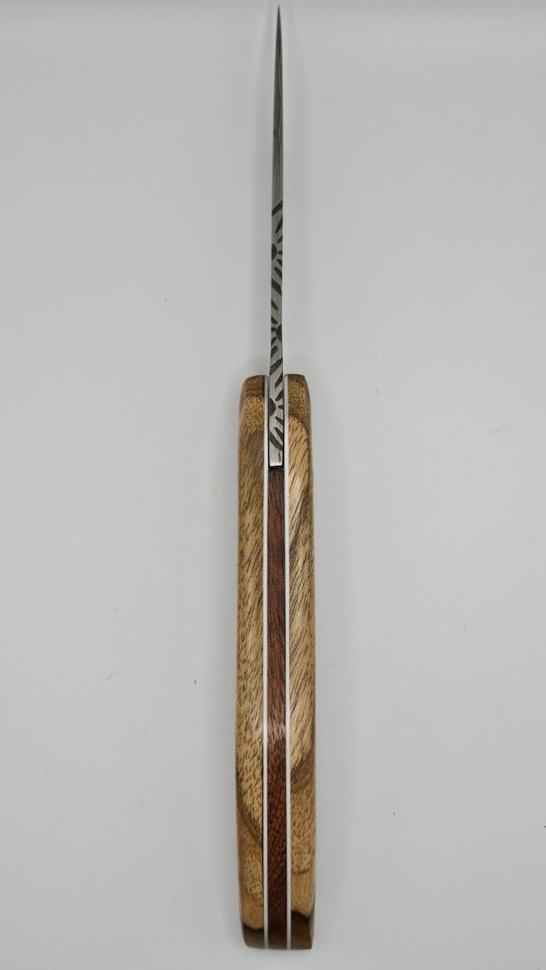 Couteau d’office en plate semelle. Lame DAMAS 48 couches en XC75 et 15N20. Bois Exotique, rivets en laiton. Longueur de la lame 10.5 cm pour une longueur totale de 21 cm.